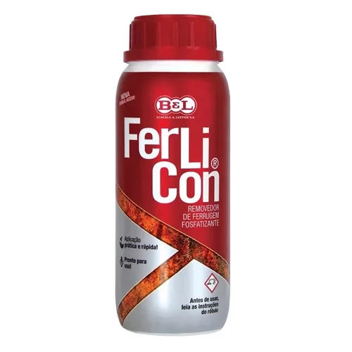 Removedor de Ferrugem Ferlicon 1L BEL.Preparador de superfícies metálicas para recebimento de pintura. Tem um alto poder para desoxidar, removendo a ferrugem, ao mesmo tempo, em que fosfatiza.Pode aumentar a aderência da pintura de acabamento, tornando a peça mais resistente ao aparecimento da ferrugem. É indicado para indústrias mecânicas, manutenção, indústria naval e recuperação de superfícies de ferro e aço em geral.Aplicação prática e rápida.APLICAÇÃO: Use luvas de proteção, roupa de proteção, proteção ocular, proteção faciallave as mãos cuidadosamente após o manuseio. 1 - Remova toda a sujeira, óleo e crostas de ferrugem por meio mecânico (escova de aço, martelo e outros) para o produto poder atingir toda a superfície metálica. 2 - Aplique o produto com pincel, pistola ou por imersão das peças. Aguarde por 20 a 60 minutos, pois é o tempo necessário à completa reação. Remova todos os resíduos excedentes com tíner. 3 - Caso a ferrugem não seja totalmente eliminada ou transformada (escurecida), deve-se repetir a operação. Recomenda-se deixar a peça em repouso por 24 horas. 4 - Depois, aplique pintura de fundo e acabamento de qualidade.