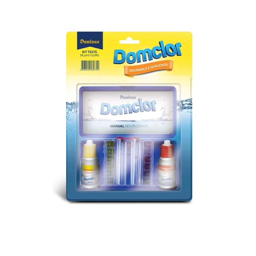 Kit para teste de pH e Cloro. Excelente auxiliar para um controle efetivo da qualidade da água da piscina. Blister com estojo, manual do utilizador, comparador de análise e uma unidade de 20 ml dos reagentes Vermelho Fenol e Ortotolidina .